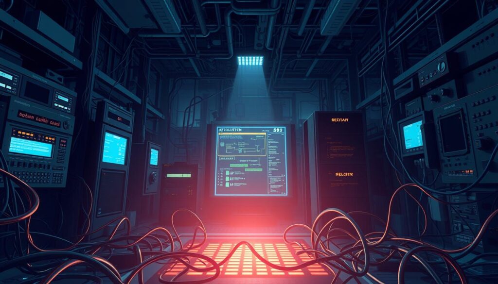 A complex system of interlinked components, legacy systems loom in the background, casting shadows over a sleek, modern interface. In the foreground, a tangle of wires and cables snakes through the frame, symbolizing the technical challenges of integration. Cinematic lighting illuminates the contrast between old and new, creating a sense of tension and unease. The scene is captured through a wide-angle lens, emphasizing the scale and complexity of the challenge. An atmosphere of uncertainty and fragmentation pervades the image, underscoring the need for innovative solutions to bridge the divide between legacy and emerging technologies.