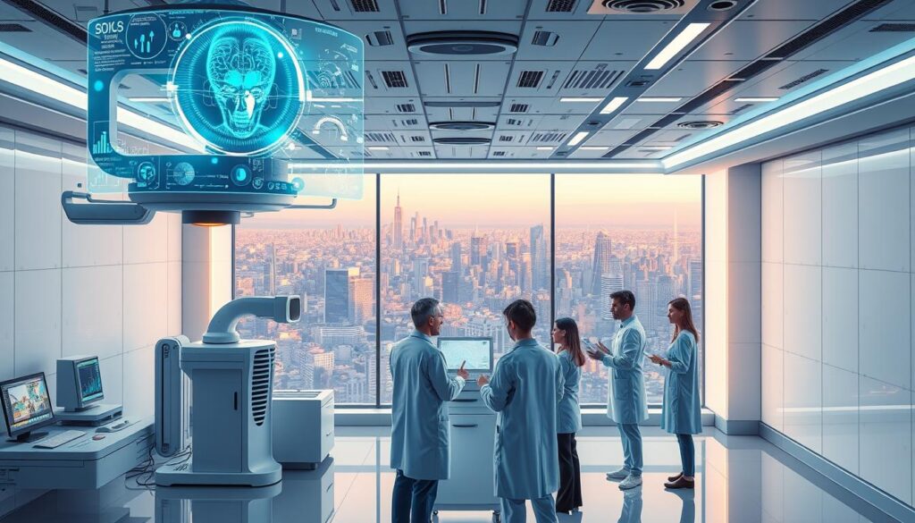 A futuristic medical diagnostic hub with sleek, state-of-the-art equipment suspended in a brightly lit, minimalist clinical setting. In the foreground, a holographic display showcases real-time patient data and AI-generated insights. In the middle ground, a team of medical professionals interact with advanced touchscreen interfaces, analyzing test results and coordinating treatments. The background features a panoramic view of a bustling urban skyline, conveying a sense of the integrated, high-tech nature of this next-generation healthcare system.