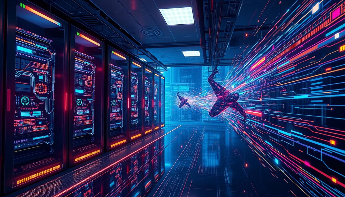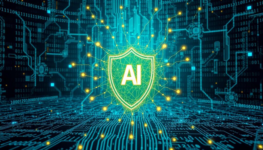 Artificial intelligence is changing digital security. It helps companies get better at fighting cyber threats. AI can spot and understand threats faster than people can6. This is key because hackers are using AI to scan for weaknesses on a huge scale6.