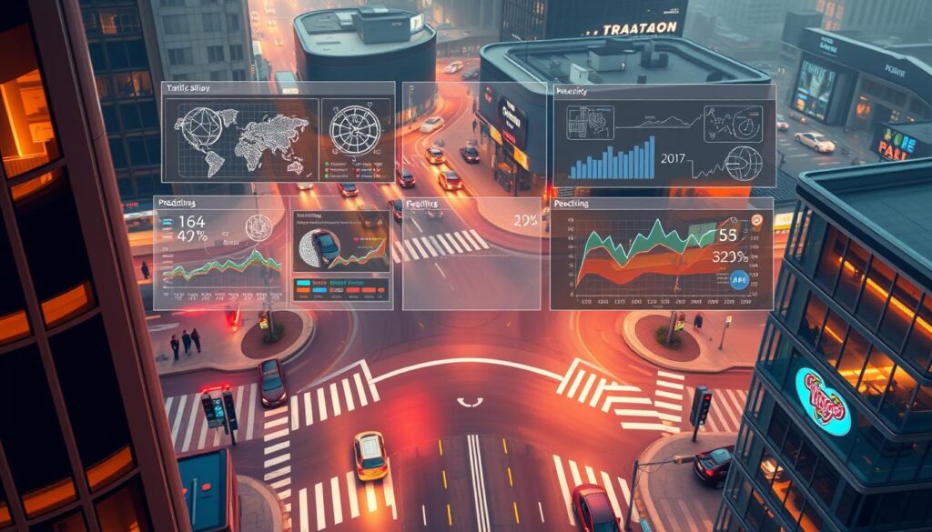 A bustling urban intersection, seen from an elevated perspective, with a sophisticated traffic analysis dashboard overlaying the scene. The dashboard displays real-time data visualizations, including traffic flow patterns, vehicle density heatmaps, and predictive analytics. The intersection is illuminated by warm, diffused lighting, creating a visually striking and technically complex composition. Sleek, modern architecture frames the scene, conveying a sense of forward-thinking urban planning and technology-driven infrastructure. The overall atmosphere is one of efficiency, innovation, and data-driven decision-making, reflecting the AI-optimized nature of the traffic signals.