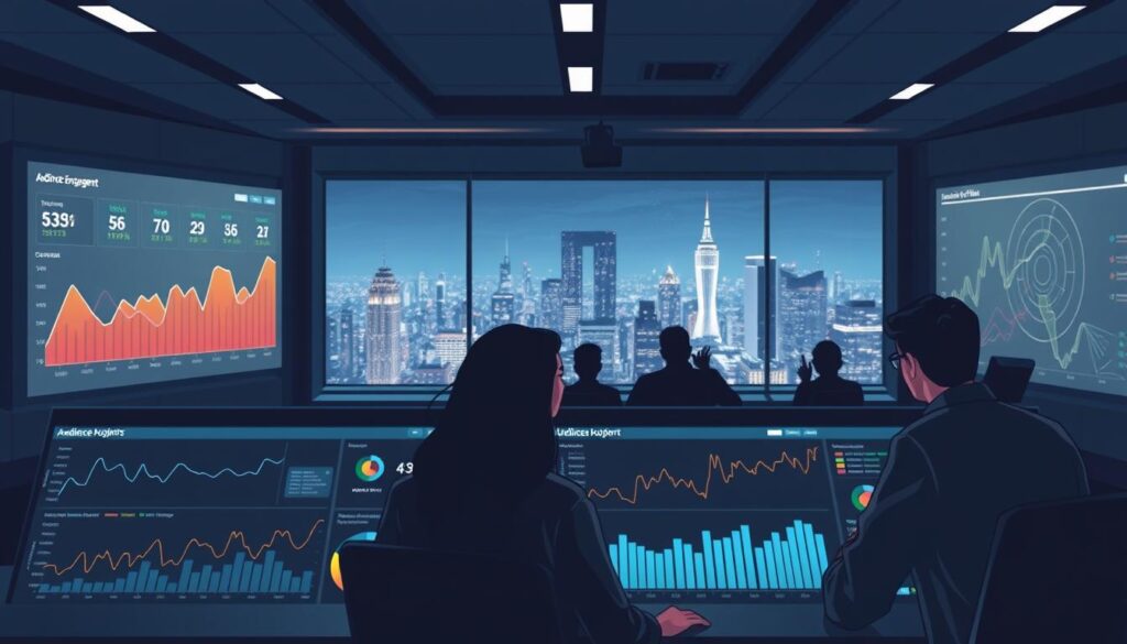 A sleek, modern data visualization dashboard set against a backdrop of a dimly lit, high-tech control room. In the foreground, a series of interactive graphs and charts showcase audience engagement metrics, their lines and curves pulsing with real-time data. The middle ground features a team of analysts intently studying the dashboard, their faces illuminated by the soft glow of the screens. In the background, a large, panoramic window offers a glimpse of a bustling city skyline, hinting at the broader context of the streaming platform's operations. The overall atmosphere is one of analytical precision, data-driven decision making, and a sense of anticipation around audience engagement.