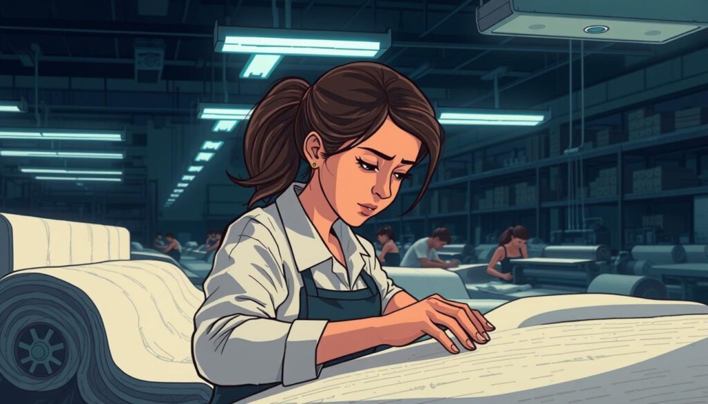 A dimly lit textile factory floor, workers hunched over bolts of fabric, scrutinizing each inch with intense focus. Fluorescent overhead lights cast long shadows, highlighting the intricate weave patterns and potential flaws. In the foreground, a worker pauses, her brow furrowed as she delicately runs her fingers across the fabric, searching for the slightest imperfection. The background is a maze of industrial shelving, spools of thread, and the faint hum of machinery. The atmosphere is one of concentration and manual precision, a stark contrast to the promise of automated, AI-driven fabric inspection.