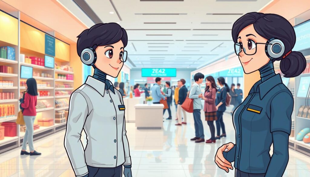 A vibrant retail setting with sleek, advanced virtual assistants engaging with customers. In the foreground, lifelike AI agents in crisp, modern uniforms stand ready to assist, their faces conveying warmth and approachability. The middle ground features a lively store interior, with clean lines, muted tones, and strategically placed digital displays. In the background, a panoramic view of the bustling retail floor, where customers seamlessly interact with the virtual assistants, their expressions conveying trust and satisfaction. The scene is bathed in soft, diffused lighting, creating a sense of sophistication and technological progress.