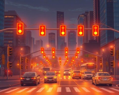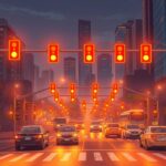 A series of traffic signals evolving through the ages, from simple manual switches to cutting-edge AI-powered smart signals. In the foreground, a retro-styled traffic light with incandescent bulbs glows against a hazy urban backdrop. In the middle ground, a modern LED-based signal sways gently, its colors shifting dynamically. In the distance, a futuristic traffic control hub looms, its sleek, angular design and holographic displays hinting at the AI-driven, connected technologies of tomorrow. The scene is bathed in a warm, sunset-tinged lighting, creating a nostalgic yet forward-looking atmosphere.