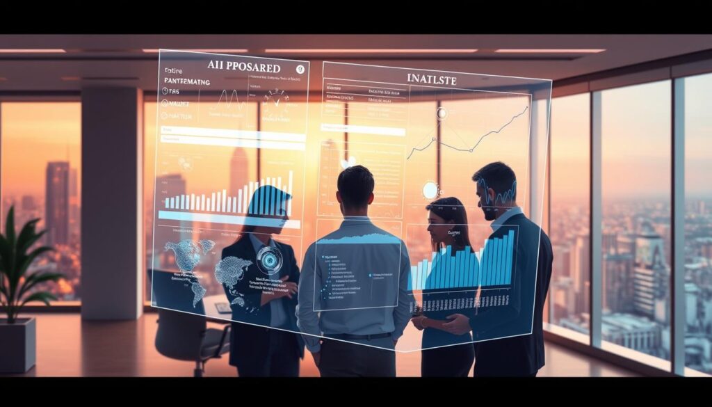 A sleek, minimalist office interior with large windows overlooking a vibrant cityscape. In the foreground, a holographic display showcases AI-powered matchmaking algorithms, visualized as dynamic data streams and interactive graphs. In the middle ground, a team of analysts pore over the displayed analytics, their expressions focused as they fine-tune the matching process. The background is bathed in a warm, diffused lighting, creating a sense of technological sophistication and productivity. The overall atmosphere conveys the seamless integration of AI-driven insights into the sponsorship matchmaking workflow.