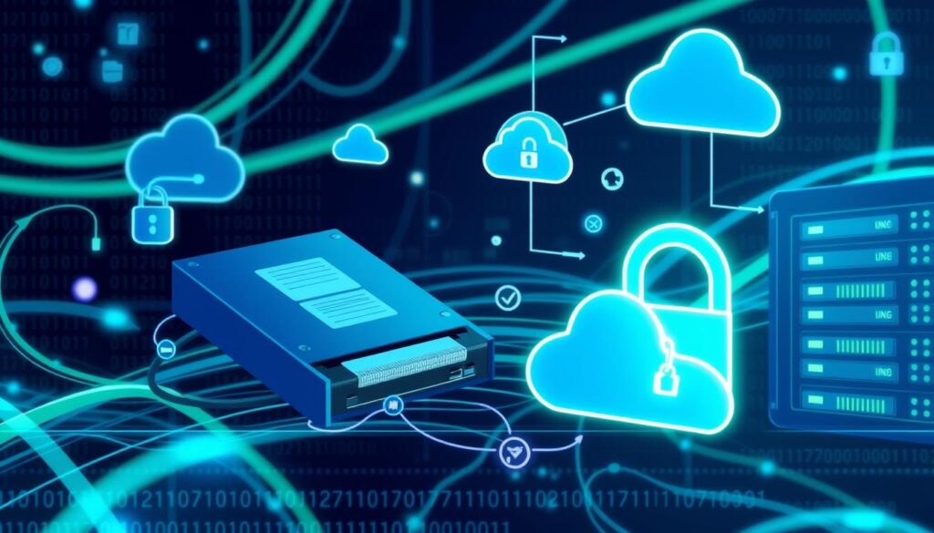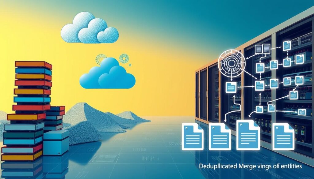 In the world of data management, new methods like data deduplication and compression are key. They help companies save space and keep their data safe11. Deduplication removes duplicate data, which is very important for cloud backups12. It makes storage needs smaller. Data compression also helps by making files smaller, speeding up data transfer, and cutting costs.