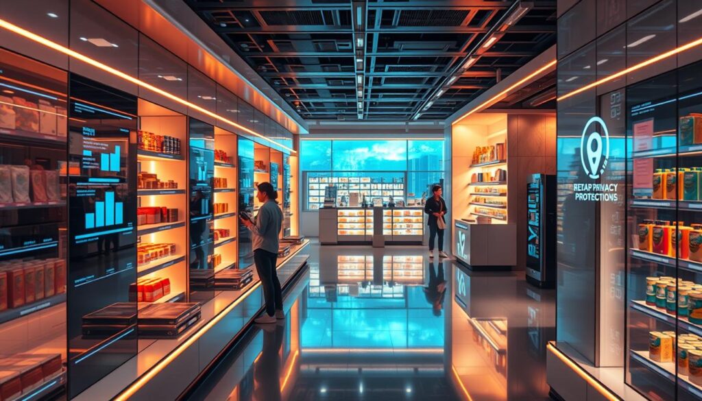 To lower these risks, retailers need to focus on data protection. This includes using encryption and access controls. Doing so can cut data breach risks by 60%6. Also, adding privacy by design to AI systems can reduce breach risks by 50%7.