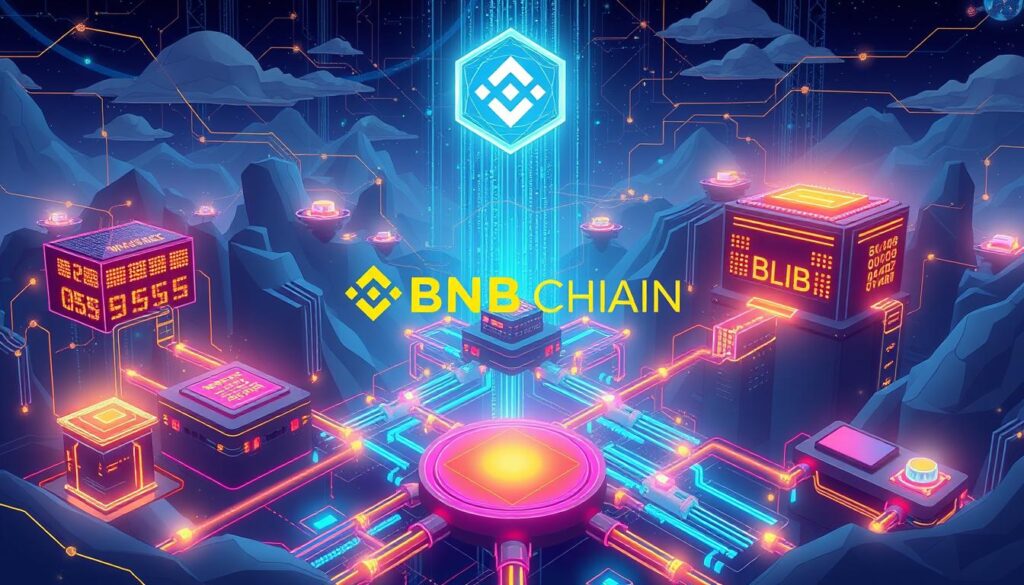 BNB Smart Chain, also known as Binance Smart Chain (BSC), has a strong technical setup. It’s made for the growing need for smart contracts and decentralized apps in the blockchain world9. Being fully EVM-compatible, BSC makes it easy for developers to move their Ethereum smart contracts. This lets them use their skills and resources without a hitch9.