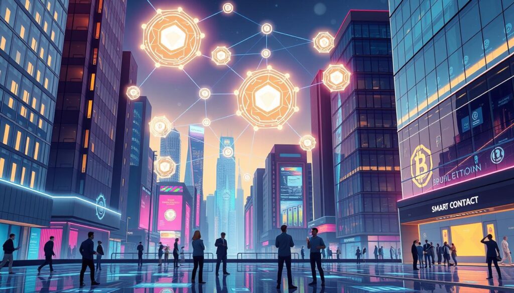 Blockchain technology and smart contracts are changing how businesses work in many fields29. In finance, DeFi platforms are shaking up banking by letting people lend and borrow directly30. Supply chains are getting better thanks to blockchain, making them more open and efficient. The real estate world is also changing, with new ways to buy and keep records of property. Insurance companies are looking into smart contracts for quicker claims processing30.