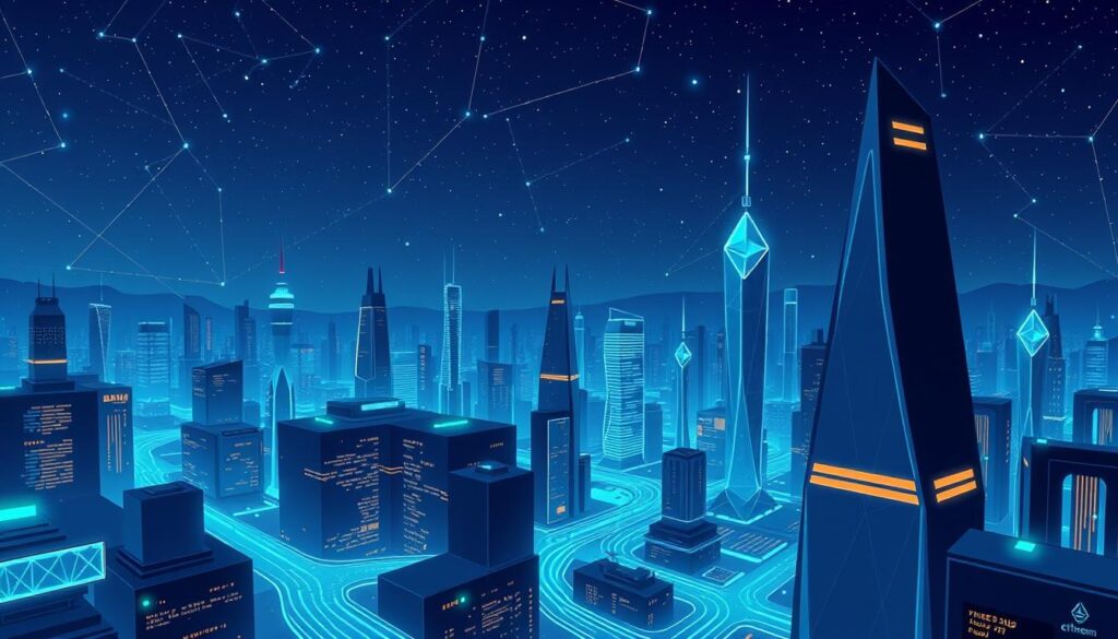 Ethereum has become a key player in the world of decentralized apps, going beyond just being a cryptocurrency31. It allows for complex agreements to be executed automatically, opening doors in finance and supply chain management. With updates like Ethereum 2.0, it’s getting better at handling more users, keeping things safe, and being kinder to the planet32.