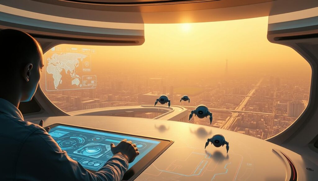 A highly advanced and immersive autonomous agents platform, showcasing a sleek and minimalist user interface. The foreground features a holographic control panel with intuitive touch-based controls, surrounded by a panoramic display that projects a detailed 3D simulation of the agents' operating environment. The middle ground reveals a cluster of intelligent agents autonomously navigating a complex, photorealistic landscape, their movements fluid and coordinated. In the background, a serene and futuristic cityscape stretches out, bathed in warm, diffused lighting that creates a sense of depth and atmosphere. The overall scene conveys a powerful, high-tech aesthetic, hinting at the platform's advanced capabilities and the seamless integration of human and machine intelligence.