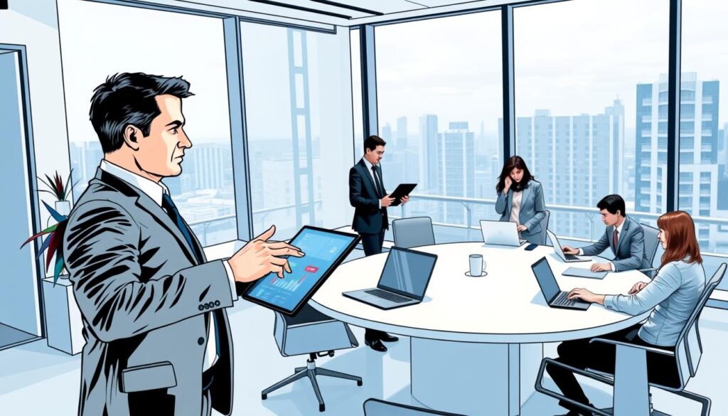 A modern, sleek office space with a team of business professionals utilizing a variety of digital automation tools. In the foreground, a well-dressed executive confidently interacts with a large touchscreen display, navigating through a suite of business management applications. Behind them, the team collaborates around a curved, minimalist conference table, laptops and tablets in hand, optimizing workflows and analyzing data visualizations projected on the wall. Soft, diffused lighting casts a productive, focused atmosphere, while the background reveals a cityscape view through floor-to-ceiling windows, symbolizing the scalable, enterprise-level nature of the depicted business automation applications.