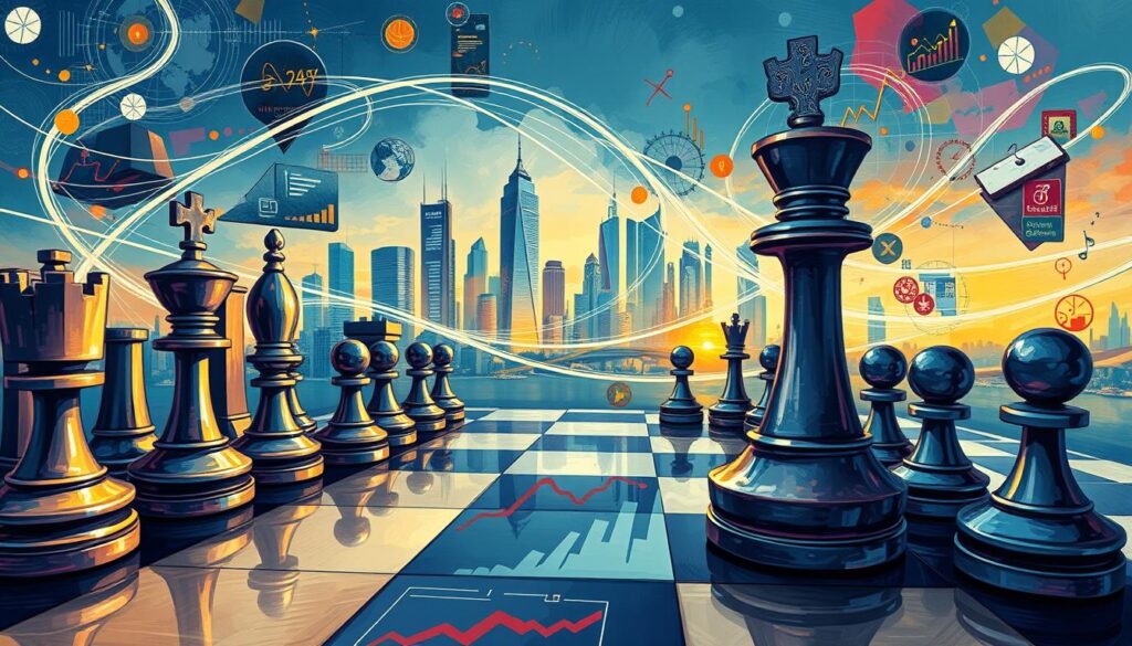 Game theory focuses on players, strategies, and payoffs4. These elements help model how companies interact. This lets businesses predict and react to their rivals’ moves4.
