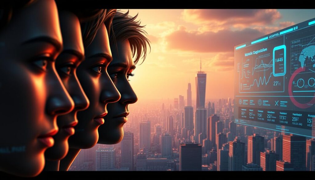 A striking digital montage showcasing sophisticated AI manipulation techniques. In the foreground, a series of AI-generated faces with uncanny realism, blending seamlessly with the background. In the middle ground, a data visualization dashboard displaying complex algorithms and neural network architectures. In the distant background, a futuristic cityscape rendered in a vibrant, almost hyperreal color palette, hinting at the potential of AI-driven urban environments. The scene is bathed in a warm, cinematic lighting, creating a sense of depth and drama. The overall composition conveys the power and sophistication of modern AI systems, while also hinting at the challenges and ethical considerations that come with their use.