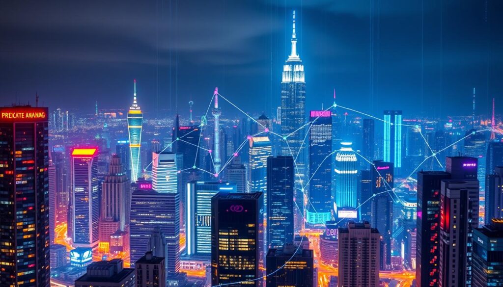 AI is changing business operations in many ways. It helps sectors like finance, healthcare, and manufacturing work better. AI quickly sorts through data, saving costs and reducing mistakes5. AI chatbots also make customer service better, and machine learning predicts outcomes based on past data5.