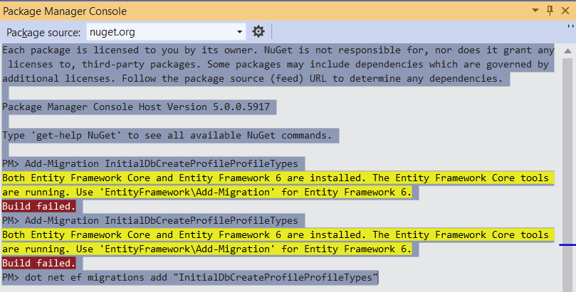 Both Entity Framework Core and Entity Framework 6 are installed. The Entity Framework Core tools are running. Use ‘EntityFramework\Add-Migration’ for Entity Framework 6.