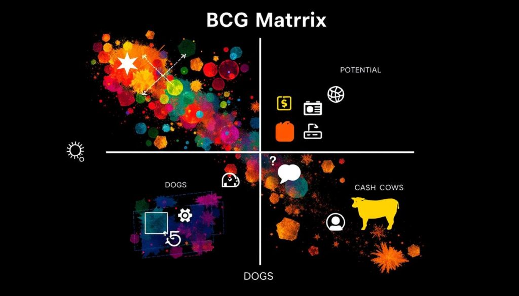 The Boston Consulting Group (BCG) Matrix is a key tool for managing your portfolio10. It sorts your offerings into four groups: Stars, Cash Cows, Question Marks, and Dogs. These are based on market growth and your share of that market10. By understanding each group, you can make smart choices to boost profits and grow your business.