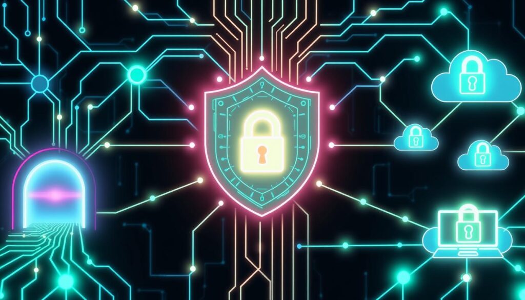 VPN protection systems have three main parts: encryption, tunneling, and secure servers. These work together to give you a safe, private way to surf the internet3. They also hide your IP address, making it harder for websites to track you and keeping your online identity private.