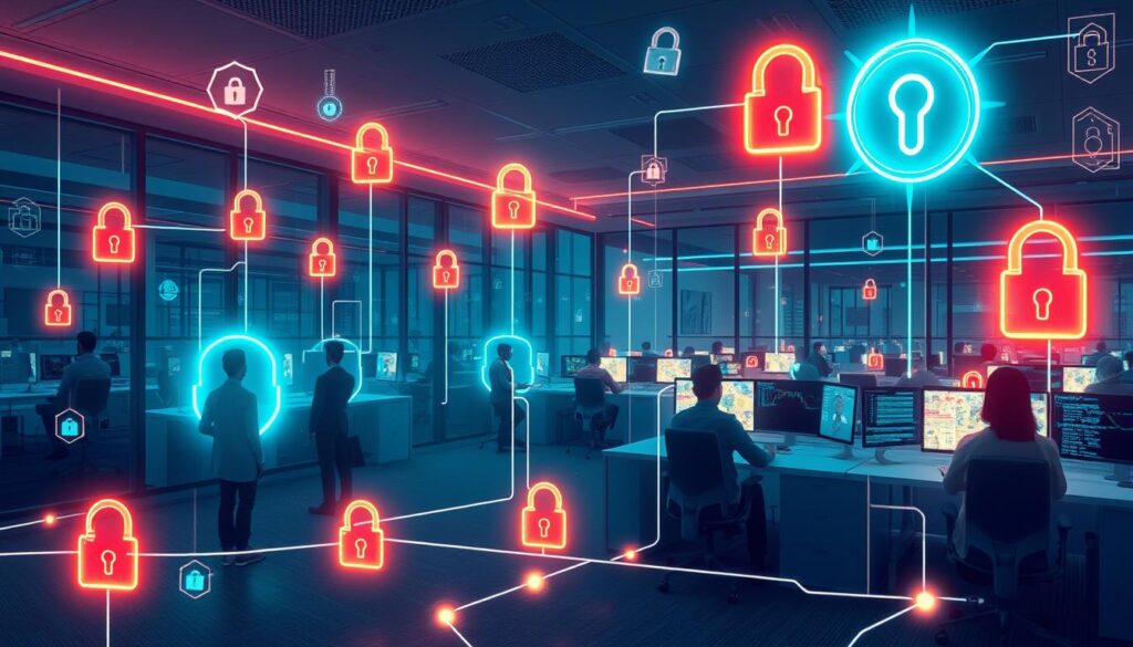 Cybersecurity awareness training is key to protecting companies from digital threats. With 74% of breaches involving people, teaching employees is essential15. A good training program can cut security breach risks by up to 70% and build a strong security culture. This makes companies 33% less likely to face cyber attacks16.