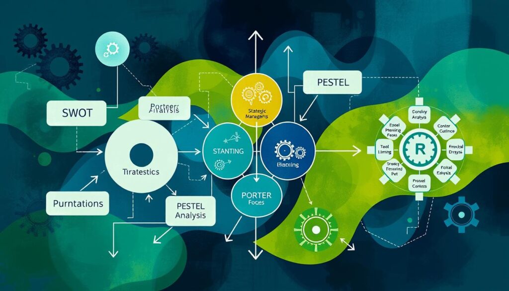 Tools like SWOT analysis and the balanced scorecard are used. They help plan and manage business initiatives. Porter’s Five Forces is also used to analyze markets.