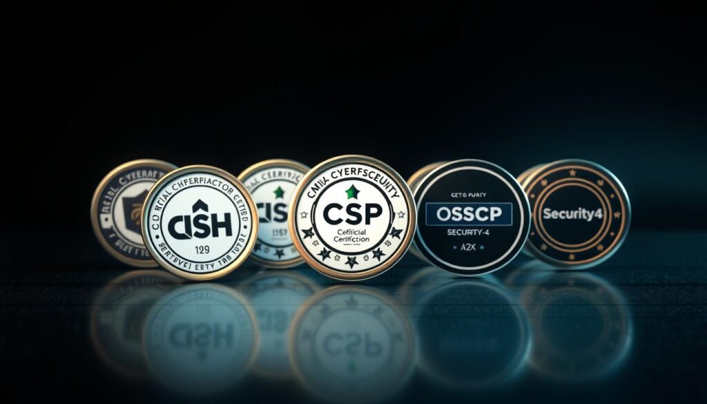 An immersive, photorealistic image of cybersecurity certification badges arranged on a sleek, metallic surface. The badges are depicted with intricate details, featuring the official logos and designs of popular certifications like CISSP, CEH, OSCP, and CompTIA Security+. The lighting is dramatic, with strategic shadows and highlights that accentuate the three-dimensional nature of the badges. The background is a minimalist, high-contrast setting, allowing the certifications to take center stage and convey a sense of professionalism and expertise. The overall composition and depth of field create a striking, visually compelling image that effectively illustrates the importance of cybersecurity certifications in boosting one's career profile.