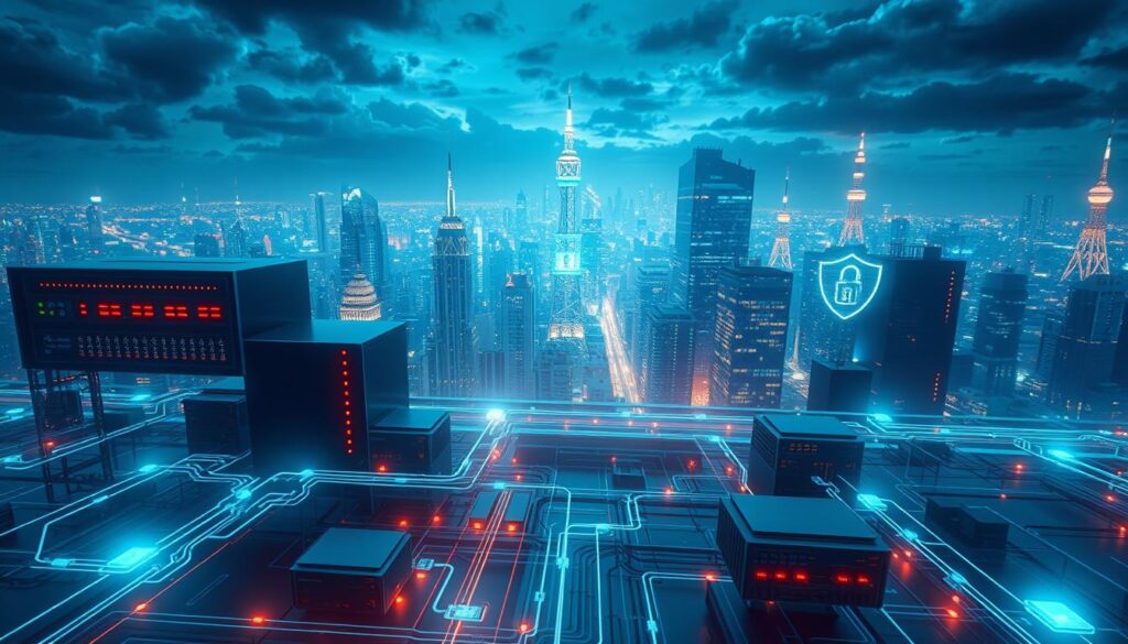 Intricate network security protocols depicted in a digital landscape. In the foreground, a dynamic visualization of encrypted data packets traversing interconnected nodes. The middle ground features sleek network hardware, firewalls, and security appliances bathed in a cool, cyberpunk-inspired lighting. In the background, a sprawling cityscape of skyscrapers and glowing communication towers, hinting at the vast scale and complexity of modern network infrastructure. The overall atmosphere conveys a sense of technological sophistication, precision, and the critical importance of robust cybersecurity measures.
