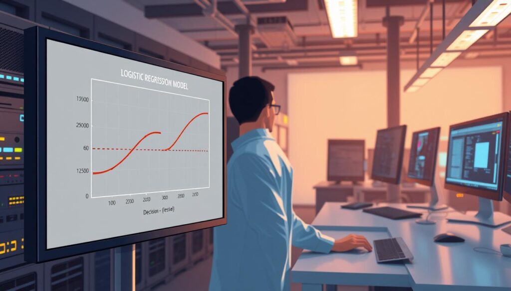 A state-of-the-art lab workspace, bathed in warm, diffused lighting. In the foreground, a high-resolution display shows a visualization of a logistic regression model, its parameters and decision boundaries clearly depicted. In the middle ground, a researcher intently examines the display, fingers poised over a sleek, modern workstation. The background features rows of server racks, blinking indicator lights, and the faint glow of monitors, creating an atmosphere of cutting-edge machine learning research and development.