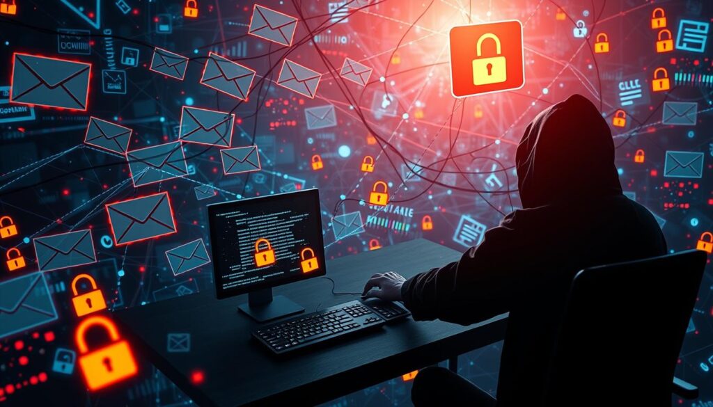 The rise of spear phishing is a big change in online fraud. It involves detailed research to create very convincing emails. These emails often target top executives, known as whaling4. This has led to huge numbers: almost 91% of cyberattacks start with phishing emails, with over three billion sent every day5.