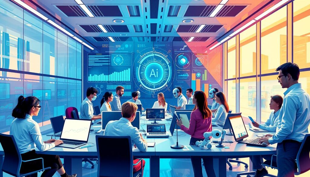 By learning these skills, you can get ready for the future of work with ai. It’s important to keep up with the AI-driven economy7. We must focus on upskilling and reskilling the workforce. This way, everyone can thrive in an AI-driven workforce8.