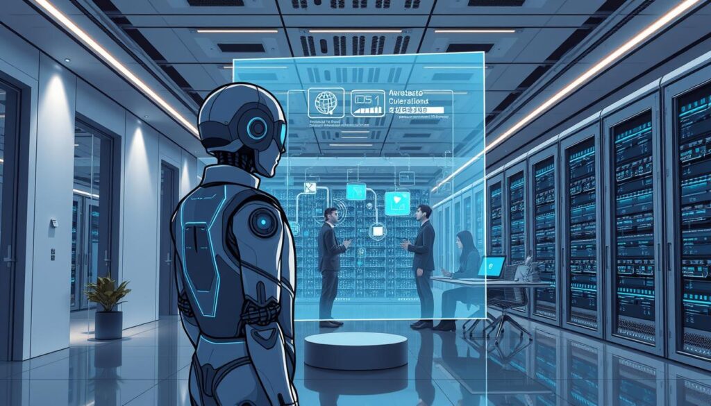 A sleek, modern office environment with a futuristic, tech-forward atmosphere. In the foreground, an autonomous AI customer service agent stands before a seamless holographic display, its digital persona engaging with a customer in a dynamic, lifelike interaction. The middle ground features a team of human and AI collaborators working in harmony, overseeing the autonomous system's operations. In the background, a vast data center hums with activity, its interconnected servers and hardware powering the intelligent, adaptive customer service solutions. Soft, ambient lighting creates a calming, professional ambiance, while the elegant, minimalist design aesthetic conveys a sense of sophistication and innovation.