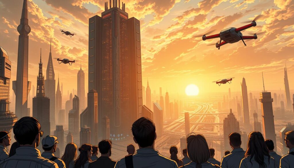 A vast and imposing cityscape of gleaming skyscrapers and soaring spires, bathed in the golden glow of the setting sun. Amidst the futuristic landscape, autonomous drones and self-driving vehicles glide effortlessly, weaving through the intricate web of interconnected roads and walkways. Towering above it all, a monolithic structure housing the latest in artificial intelligence research and development, its windows aglow with the steady hum of processing power. In the foreground, a group of people, their faces transfixed, gazing upwards in awe and wonder at the possibilities of this new era of agentic AI, their expressions a mix of excitement and trepidation. The scene is one of both technological wonder and cautious optimism, a glimpse into the potential future that awaits us.