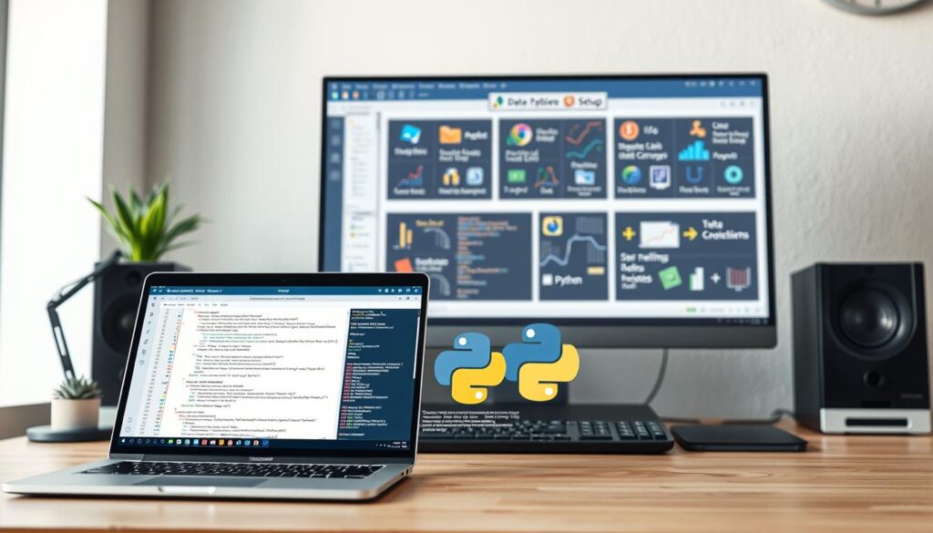 A well-lit, modern office setup showcasing Python programming tools and libraries. In the foreground, a sleek laptop displays a Jupyter Notebook with clean, organized code. Various Python icons, such as the Python logo and Matplotlib visualizations, adorn the screen. In the middle ground, a high-resolution monitor displays a comprehensive visualization of the Python setup, including popular data analysis packages, statistical libraries, and data manipulation tools. The background features a minimalist, neutral-toned wall, creating a professional, focused atmosphere conducive to data analysis and statistical exploration.