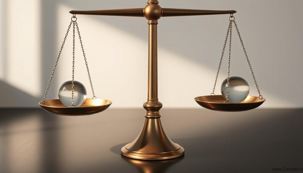 a highly detailed, photorealistic image of a set of balanced scales, symbolizing the balancing of type I and type II errors. The scales are made of polished bronze and are suspended from a sophisticated, modern tripod stand made of brushed steel. The scales are evenly balanced, with two delicate glass spheres representing the type I and type II error probabilities. The lighting is soft and diffused, creating dramatic shadows and highlights that accentuate the intricate details of the scene. The background is a minimalist, clean environment, allowing the scales to be the central focus of the image. The overall mood is one of precision, balance, and the careful consideration of statistical trade-offs.