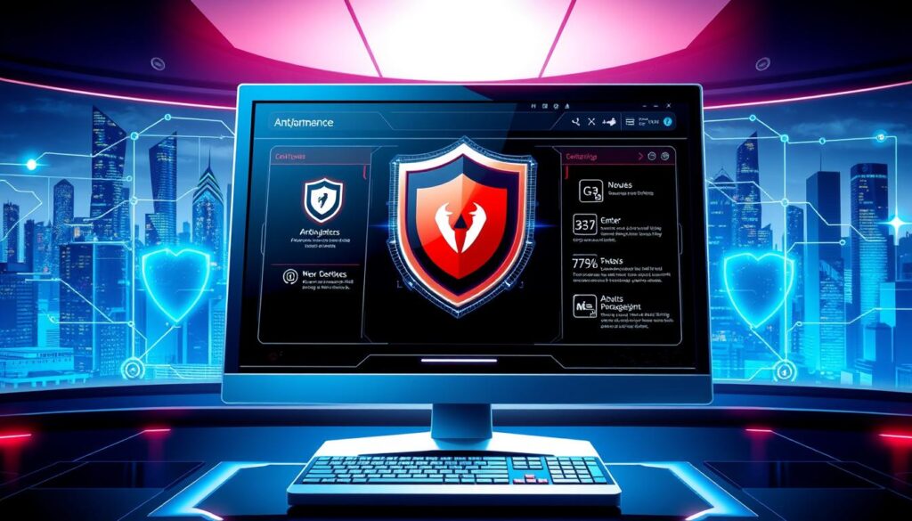 Antivirus software has important features like real-time scanning and automatic updates. These help stop cyber attacks, which are growing. Small businesses face 43% of cyber attacks7. Regular updates fix bugs and keep our software safe.