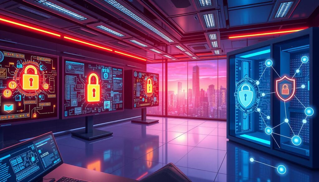 There are many types of cyber attacks, like malware, ransomware, and phishing. These show how cybersecurity challenges are always changing4. With more people working from home, protecting mobile and endpoint devices is key4. Security experts are using artificial intelligence to spot threats early, showing how technology is helping in this fight4.