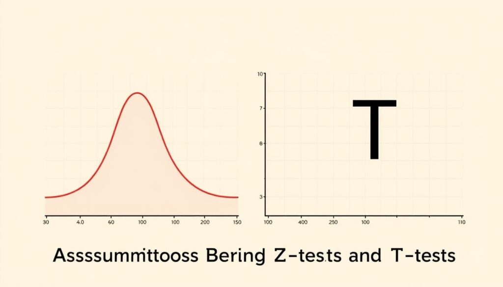 A detailed illustration of a normal distribution and a t-distribution, presented against a clean, minimalist background. The curves are rendered with precision, showcasing their distinct shapes and characteristics. The distributions are depicted in a muted color palette, creating a contemplative and analytical atmosphere. Subtle gridlines provide context and scale, guiding the viewer's understanding of the statistical concepts. The overall composition is balanced and visually compelling, effectively supporting the "Assumptions Behind Z-tests and T-tests" section of the article.