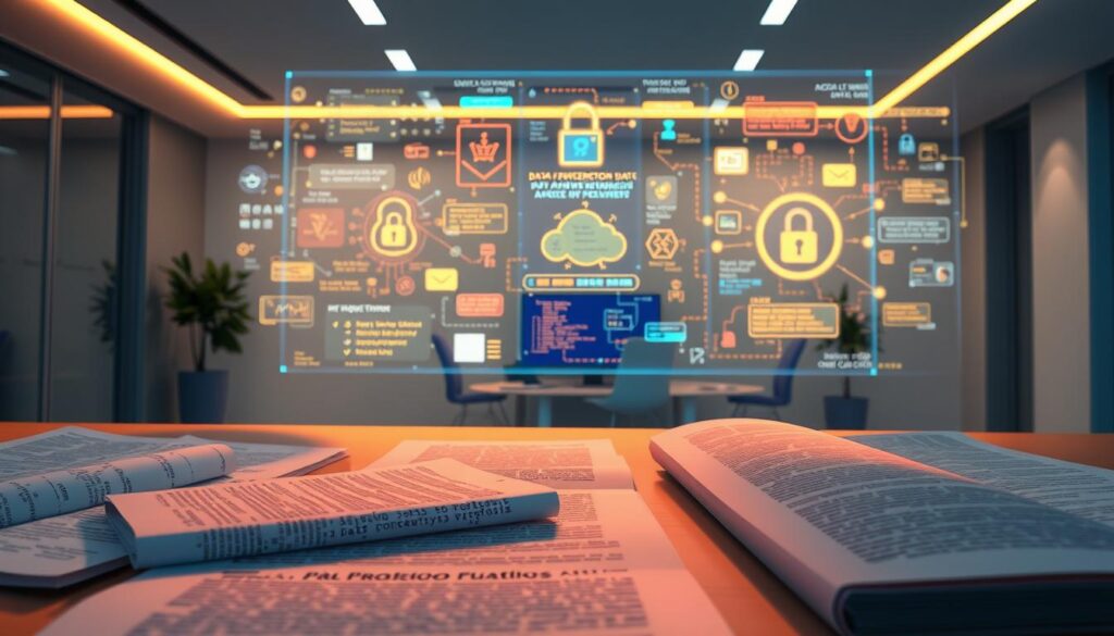A detailed analysis of data protection regulations and cybersecurity policies, illuminated by warm, directional lighting and captured through a wide-angle lens. In the foreground, a series of digital documents and legal texts are neatly arranged, conveying the meticulous and scholarly nature of the subject matter. In the middle ground, a holographic display projects vivid visualizations of data flows, access controls, and security protocols, highlighting the technical complexities involved. The background features a sleek, minimalist office setting, suggesting the professional, high-stakes environment in which these cybersecurity concerns are navigated.